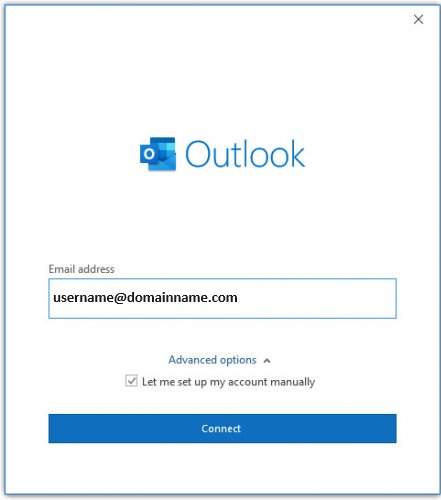 3.A dialog box will ask for your email. Choose “Let me set up my account manually” under Advanced options and click Connect.